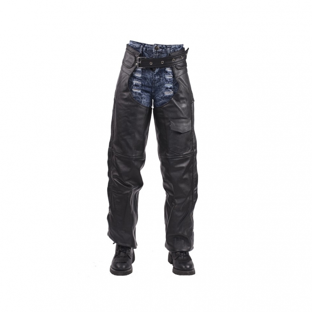 Split braided chaps made from heavy duty top grade leather but with a soft touch. Chaps have a zipper that runs along the side of the pants until it reaches the snaps at the bottom with a flap that hides the zipper.